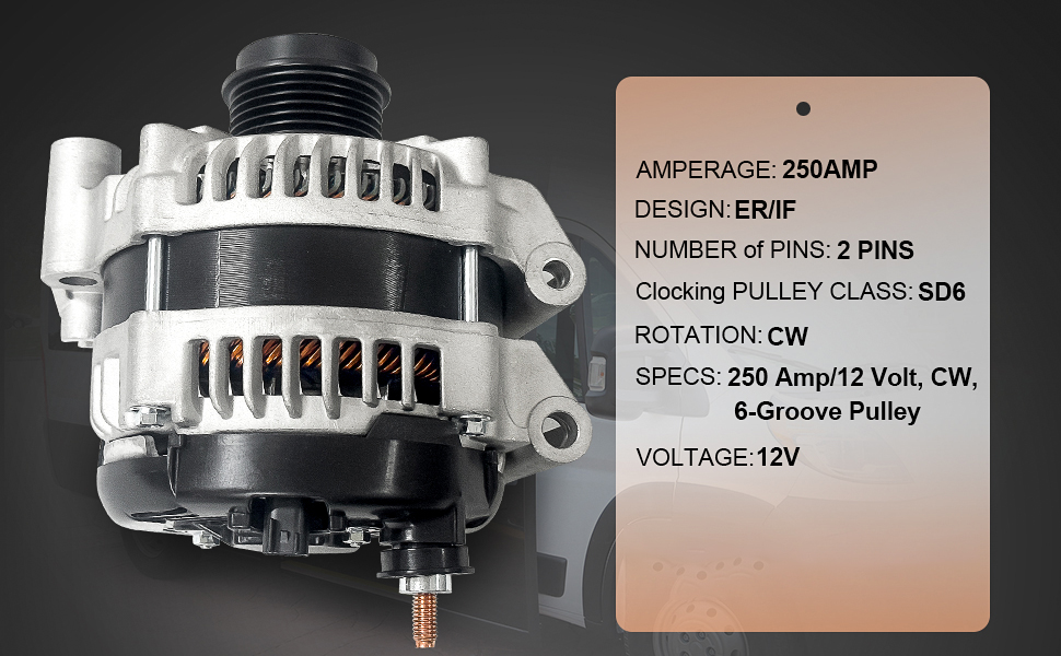 • SPECS:250 Amp/12 Volt, CW, 6-Groove Pulley